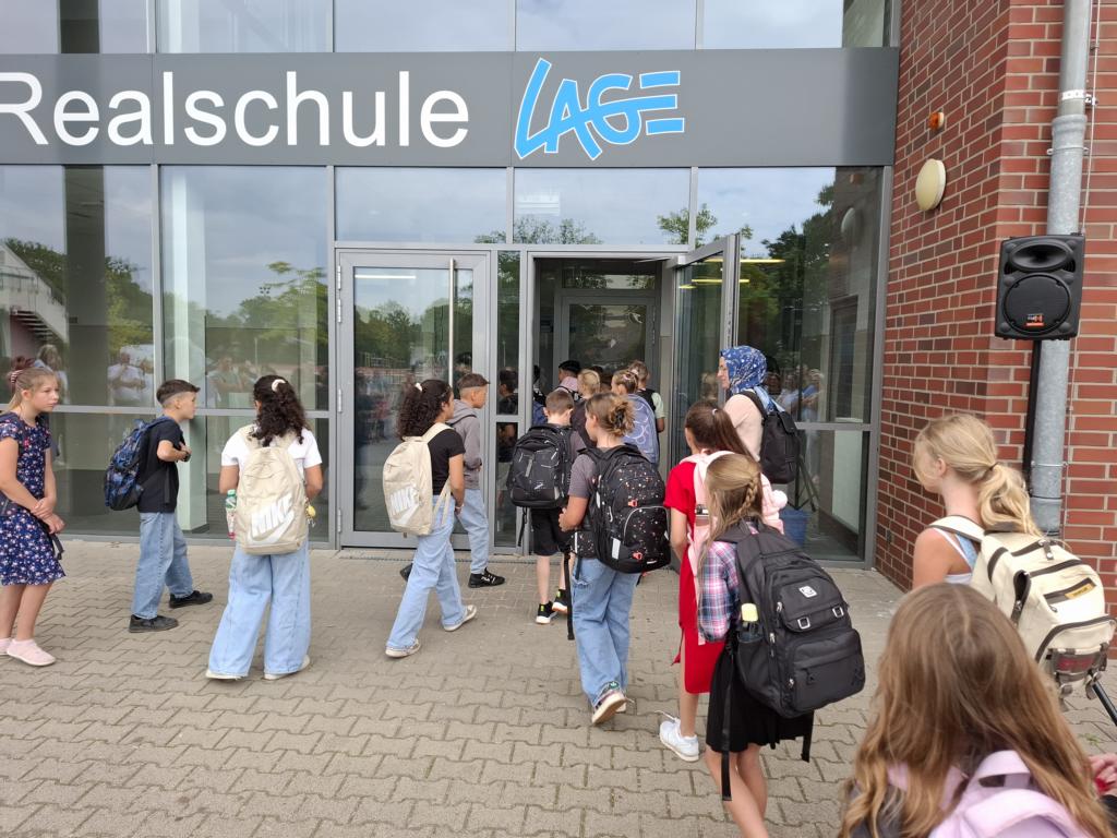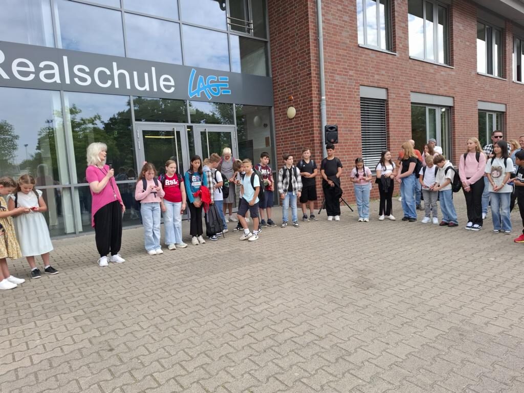Endlich! Nach einem ersten Kennenlernen vor den Sommerferien konnten wir 110 Jungen und Mädchen der neuen Klassen 5 an unserer Schule herzlich willkommen heißen. Nach einer mulitreligiösen Feier in der Lagenser Marktkirche, die unter anderem von der Kasse 06C vorbereitet worden war, wurden die Jungen und Mädchen vor dem Haupteingang von Schulleiter Jürgen Franke begrüßt. Dabei erhielten Sie als kleines Willkommensgeschenk ein Festivalbändchen mit dem Einschulungsdatum sowie einen kleinen Kompass. Dieser Kompass  – so Schulleiter Franke – soll die neuen Fünftklässlerinnen  und -klässler in den nächsten Wochen und Monaten stets daran erinnern, die Ziele für die Zeit an der Realschule Lage stets im Blick zu behalten.