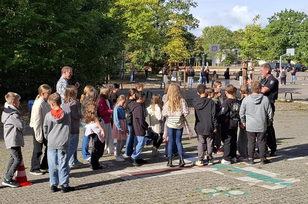 Für die meisten unserer neuen Schülerinnen und Schüler der Klassen 5 änderte sich mit dem Wechsel an unsere Schule auch der Schulweg. Viele kommen nun mit dem Bus oder mit dem Fahrrad zur Schule. Um sicherzustellen, dass alle Kinder gut in der Schule ankommen, gehört die Verkehrserziehung als ein fester Baustein zu den ersten Schulwochen. Herr Kuhlemann von der Polizei, den viele bereits von der Grundschule kennen, thematisierte mit den den Kinder der fünften Klassen und deren Klassenleitungen das richtige Verhalten auf dem Schulweg, die Bedeutsamkeit der Verkehrssicherheit der Fahrräder und einiges mehr. Beitragsfoto zeigt die Klasse 05A mit Klassenlehrer Wolfgang Somsen und Herrn Jörg Kuhlemann von der Polizei.