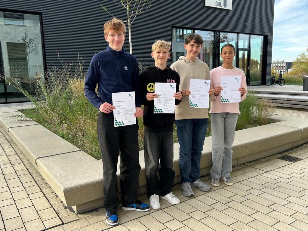 Auf dem Foto sind unsere neuen Medienscouts mit ihren frisch erworbenen Zertifikaten zu sehen: Tim Tegtmeyer (09D), Elia Kramp (09A), Simon Pasedag (09C) und Maria Sanni (09A). Auf dem Bild fehlt Julia Heidebrecht (09D), die ebenfalls als Medienscout ausgebildet wurde.